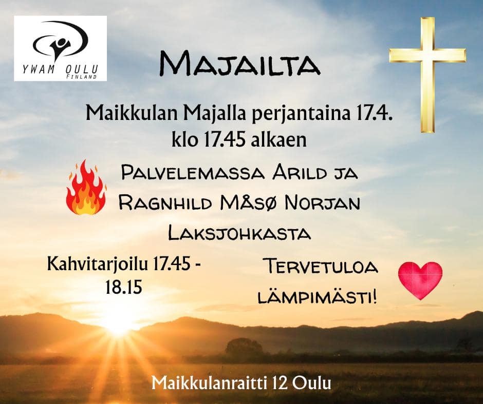 Lämpimästi tervetuloa YWAM Oulun Majailtoihin Jumalan Sanan, ylistyksen ja rukouksen pariin perjantaisin klo 18 Maikkulan Majalle (Kangaskontiontie 9A) Siunataan yhdessä Oulua ja lähiseutua!