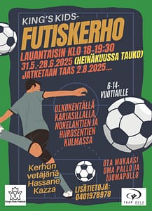 King’s Kids -futiskerho lauantaisin 31.5.-28.6.2025 klo 18-19:30 ulkokentällä Nokelantien ja Hiirosentien kulmassa Karjasillalla.