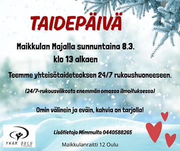 https://www.youtube.com/watch?v=-aFqqHbbM5g&t=86s maaliskuu 2026 ma ti ke to pe la su 1 2345678 9101112131415 16171819202122 23242526272829 3031 https://www.youtube.com/watch?v=-aFqqHbbM5g&t=90s Date 08 maalis 2026 Expired! Time 13:00 - 17:00 Taidepäivä Teemme yhteisötaideteoksen 24/7 -rukoushuoneeseen. Omin välinein ja eväin, kahvia on tarjolla. Lisätietoja Mimmulta 0440588265. Share this event + Add to Google Calendar + iCal / Outlook export